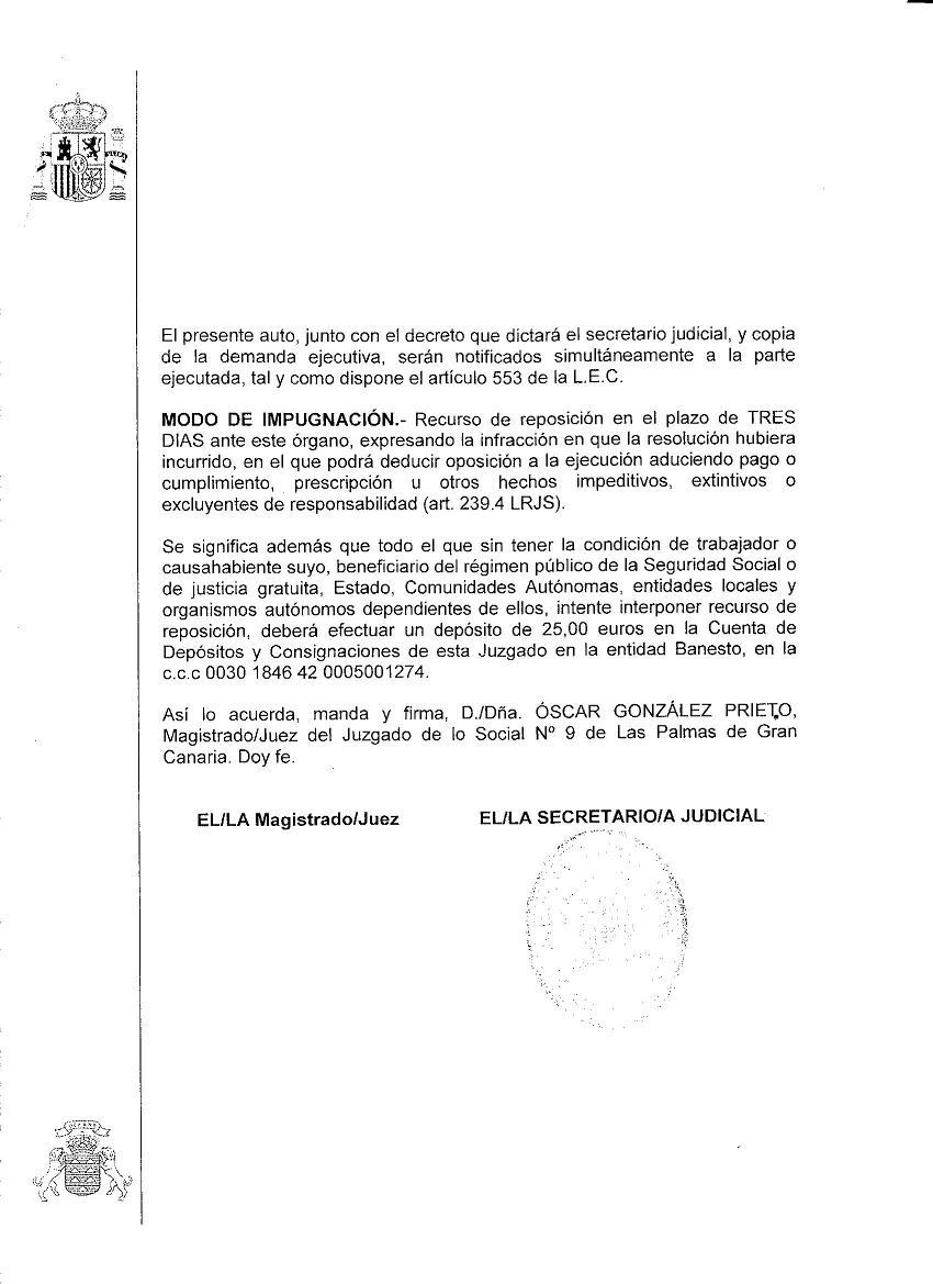 Después de haber esperado desde el mes de septiembre hasta marzo (6 meses), al objeto de dar plazo a la dirección de la empresa para buscar una solución satisfactoria al pago de las cantidades adeudadas a la plantilla, el despacho de abogados del CATT, al no haber habido reunión ni acuerdo al respecto ha decidido ejecutar todas y cada una de las sentencias firmes pendientes de abono por parte de la empresa, adjunto les remito la tercera que nos ha llegado: